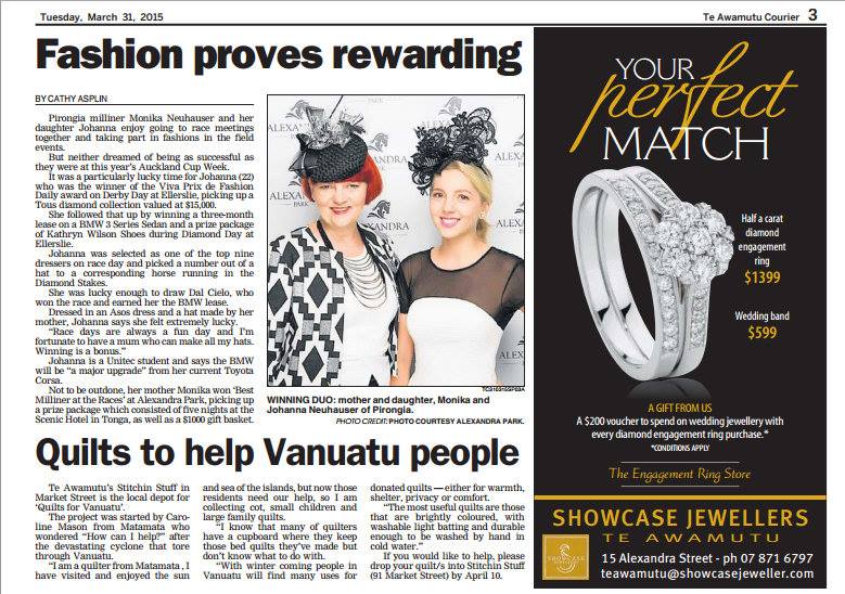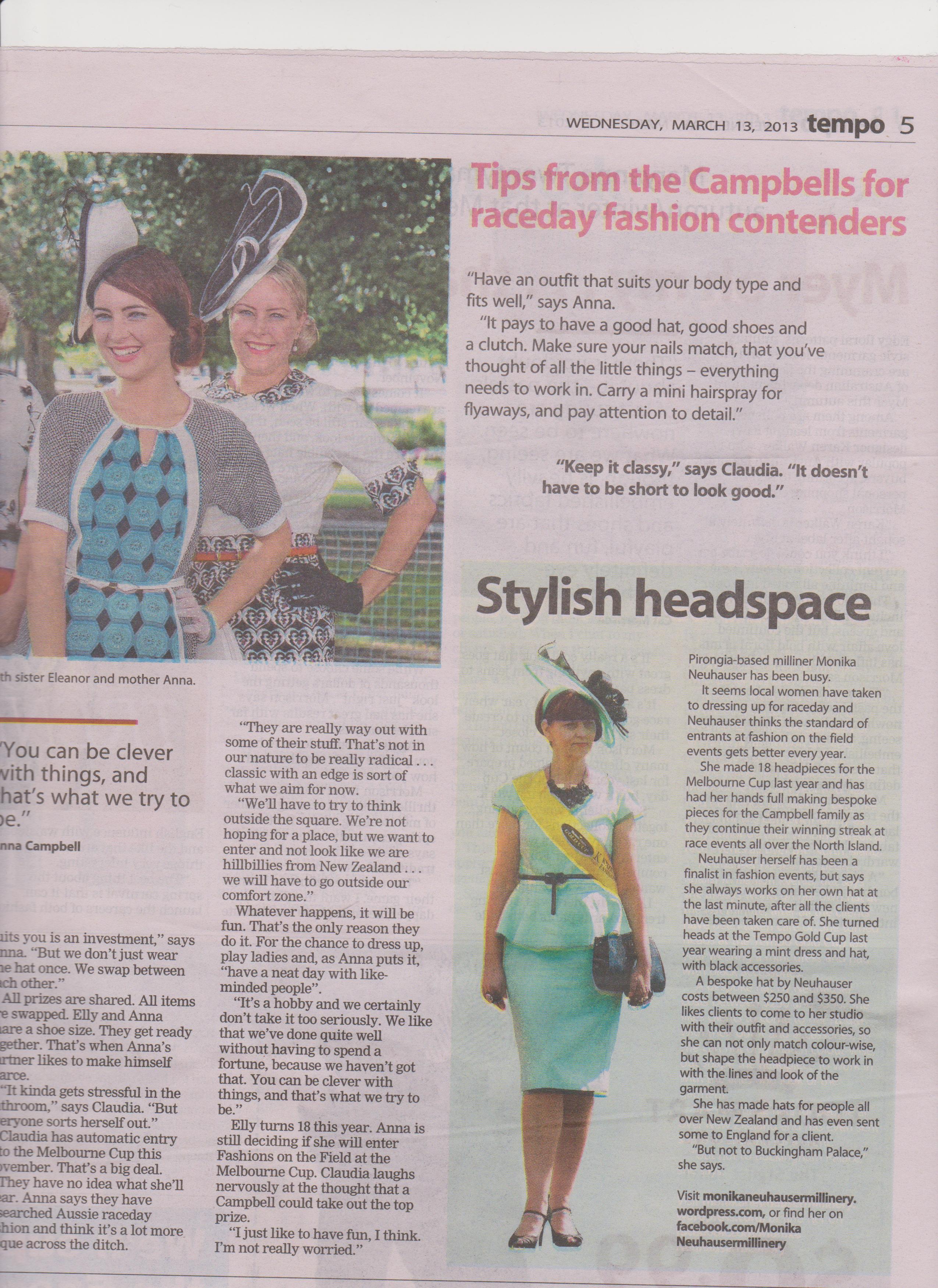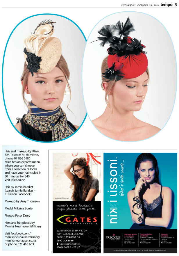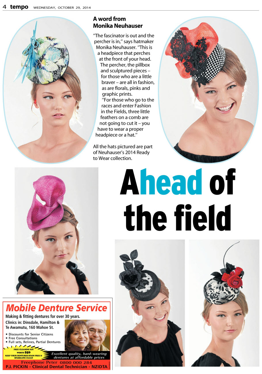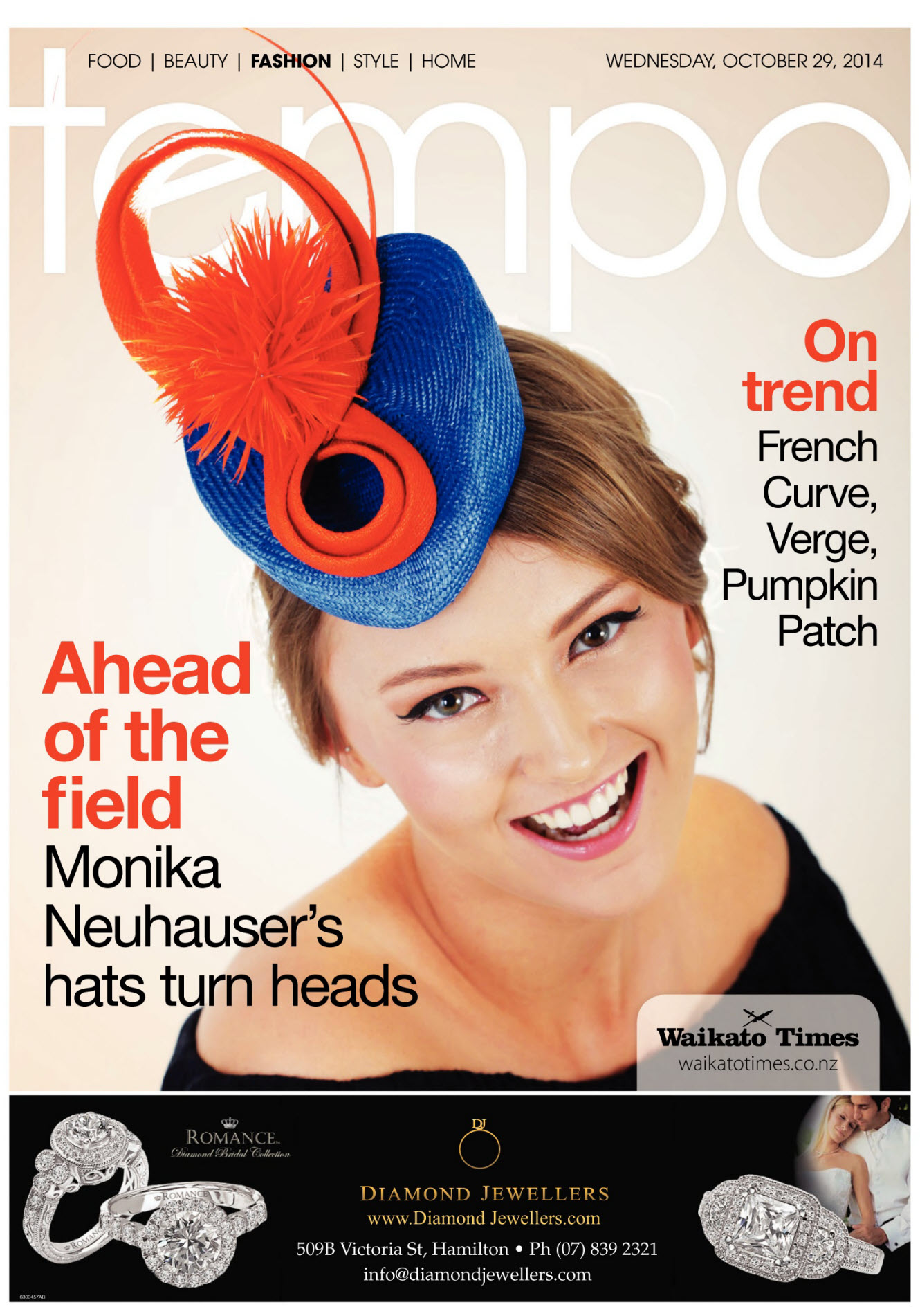Monika Neuhauser Millinery leads fashion trends with original designs. Race Day Fashion in the Fields contestants proudly wear these designs, carefully selected to augment their outfits. Be sure to stand out from the crowd with Monika Neuhauser Millinery as seen in Tempo, Waikato Times, NZ Herald and New Idea.